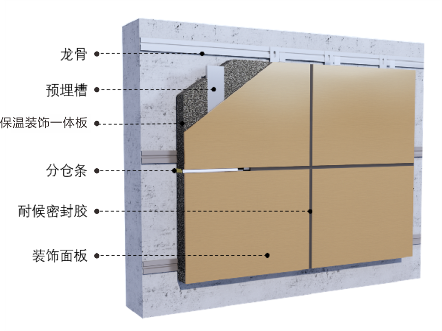 2.施工效率高:施工現(xiàn)在不再需要配置涂抹砂漿粘結(jié)劑,通過龍骨的安裝,固定保溫裝飾一體化板,具有裝配式安裝作業(yè)的特點(diǎn),施工工藝簡便、施工效率高、節(jié)省工期、品質(zhì)易控;